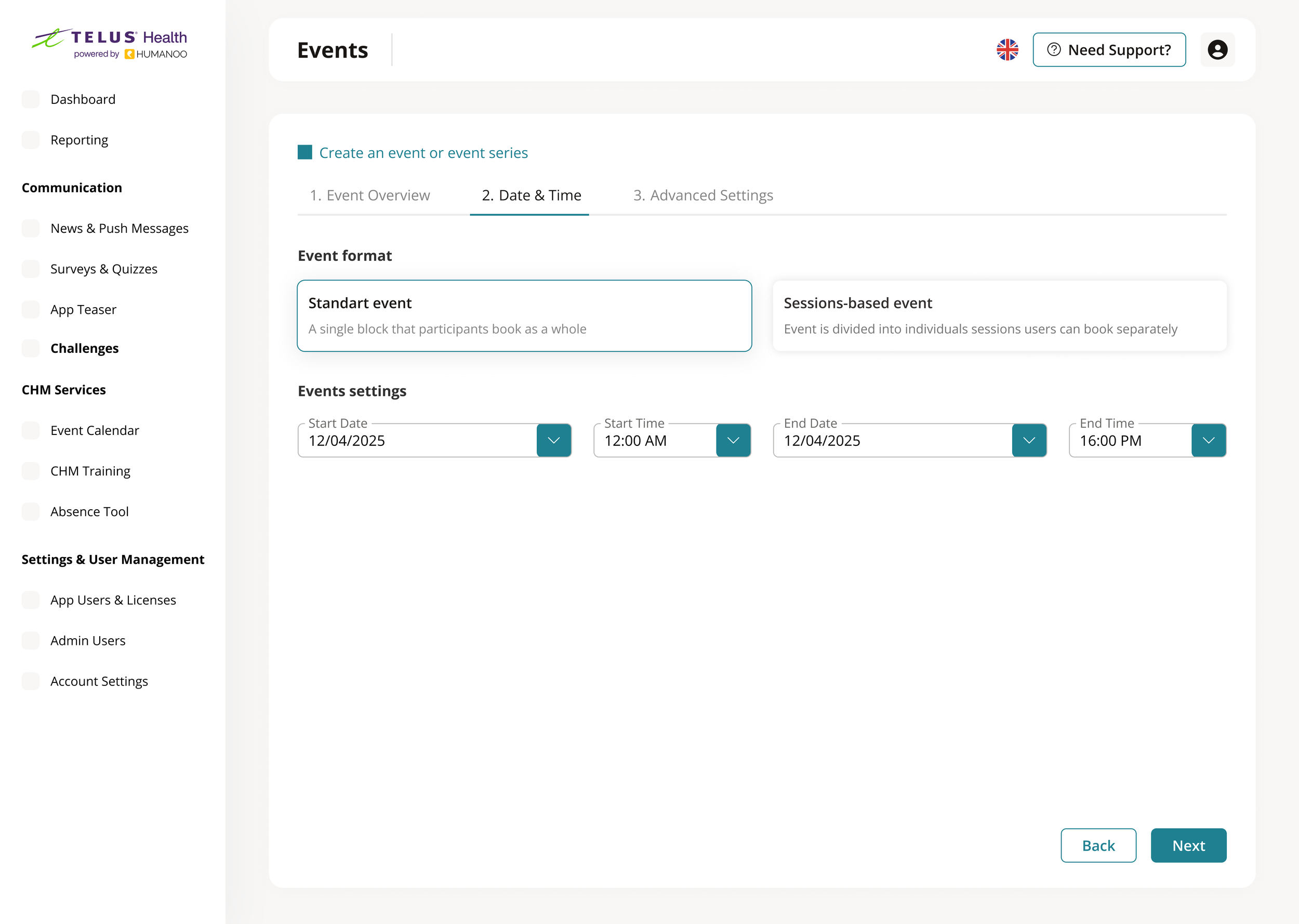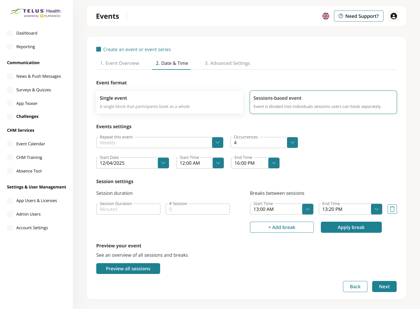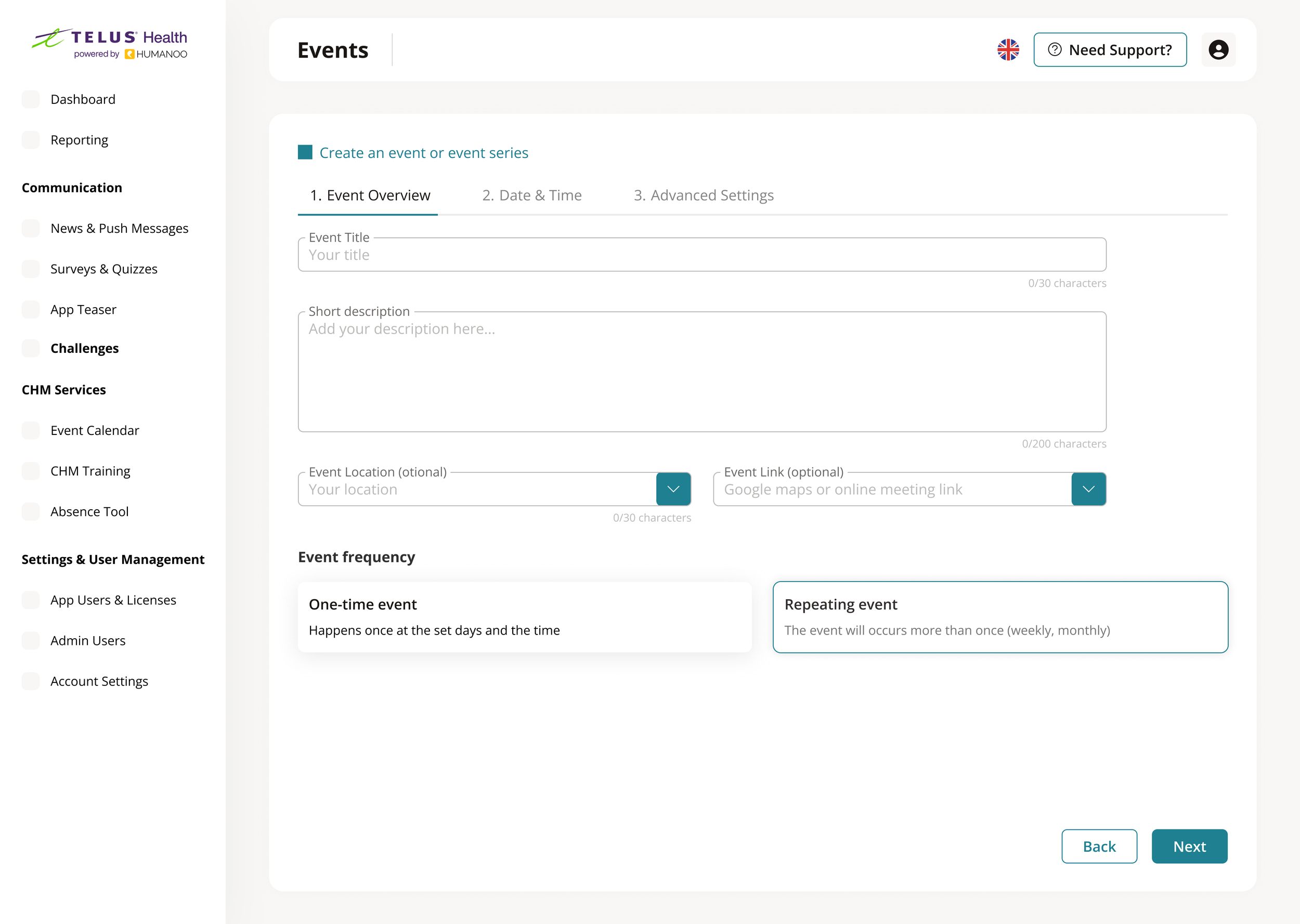 In HealthOS, HR admins create wellbeing events such as courses, workshops, and recurring sessions that are central to company wellbeing programs. While these events are critical, the process of setting them up was dense, knowledge-heavy, and easy to get wrong.